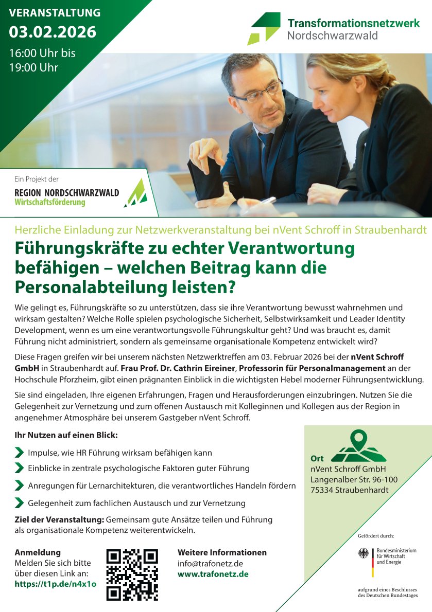 Netzwerktreffen für Personaler – Führungskräfte zu echter Verantwortung befähigen + Zu Google Kalender hinzufügen + iCal / Outlook exportieren Datum 03. Feb. 2026 Uhrzeit 16:00 - 19:00 Weitere Informationen Anmeldung Anmeldung Teile diese Veranstaltung SuchenSuchen Categories Mediathek TraFoNetz Recent Posts Wirtschaftsministerin empfängt Delegation aus dem Nordschwarzwald im Haus des Landtags Entscheidungsjahr 2025: Die Stunde der Transformation im Nordschwarzwald Impulse für die Zukunft: Transformationskongress macht Mut zur Veränderung Resolution zur Rettung der kleinen und mittleren Unternehmen im Nordschwarzwald Schlüssel zur Fachkräftesicherung – TraFoNetz-Workshop zu generationenübergreifender Zusammenarbeit