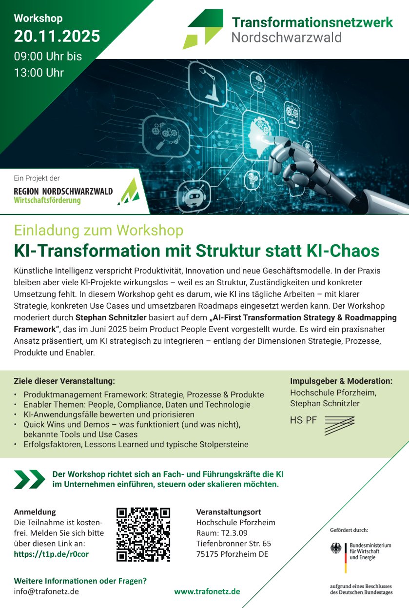 Future Lab-Workshop: KI-Transformation mit Struktur statt KI-Chaos + Zu Google Kalender hinzufügen + iCal / Outlook exportieren Datum 20. Nov. 2025 Uhrzeit 09:00 - 13:00 Weitere Informationen Anmeldung Standort Hochschule Pforzheim Raum: T2.3.09 Tiefenbronner Str. 65 75175 Pforzheim DE Anmeldung Teile diese Veranstaltung SuchenSuchen Categories Mediathek TraFoNetz Recent Posts Wirtschaftsministerin empfängt Delegation aus dem Nordschwarzwald im Haus des Landtags Entscheidungsjahr 2025: Die Stunde der Transformation im Nordschwarzwald Impulse für die Zukunft: Transformationskongress macht Mut zur Veränderung Resolution zur Rettung der kleinen und mittleren Unternehmen im Nordschwarzwald Schlüssel zur Fachkräftesicherung – TraFoNetz-Workshop zu generationenübergreifender Zusammenarbeit