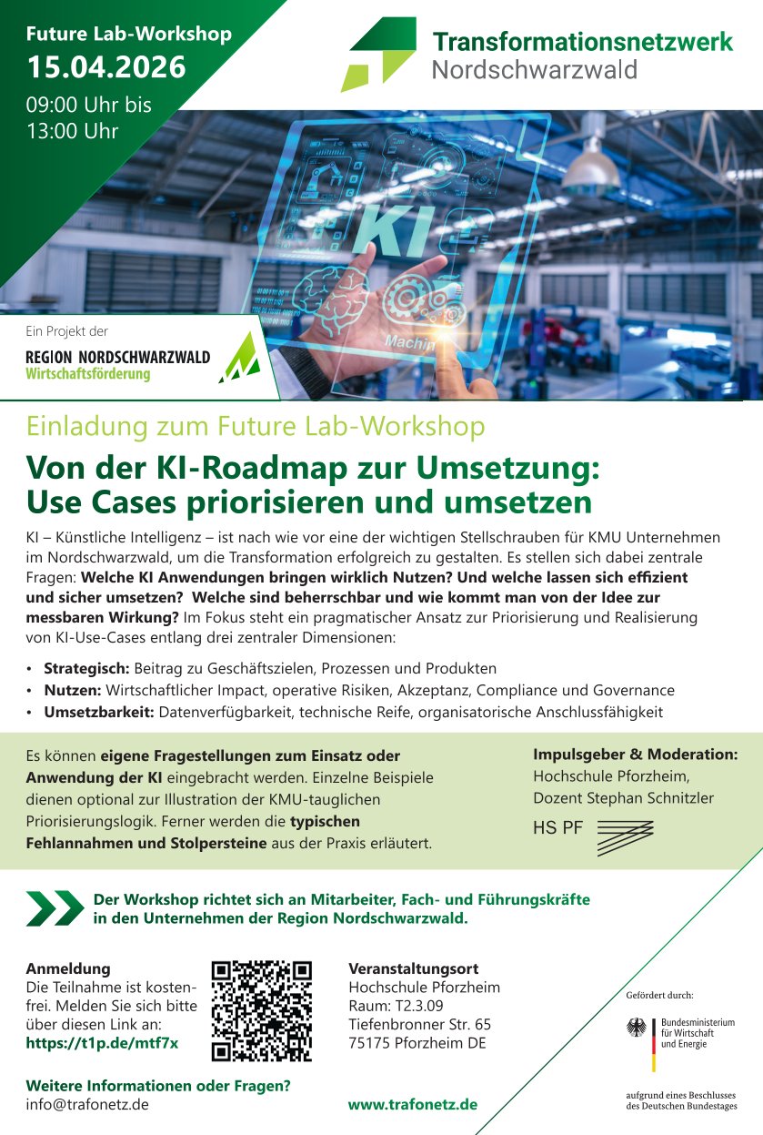 Future Lab-Workshop: Von der KI-Roadmap zur Umsetzung: Use Cases priorisieren und umsetzen + Zu Google Kalender hinzufügen + iCal / Outlook exportieren Datum 15. Apr. 2026 Uhrzeit 09:00 - 13:00 Weitere Informationen Anmeldung Standort Hochschule Pforzheim Raum: T2.3.09 Tiefenbronner Str. 65 75175 Pforzheim DE Anmeldung Teile diese Veranstaltung SuchenSuchen Categories Mediathek TraFoNetz Recent Posts Startschuss: 15 Themenkarten – 15 Chancen für die Transformation! Wirtschaftsministerin empfängt Delegation aus dem Nordschwarzwald im Haus des Landtags Entscheidungsjahr 2025: Die Stunde der Transformation im Nordschwarzwald Impulse für die Zukunft: Transformationskongress macht Mut zur Veränderung Resolution zur Rettung der kleinen und mittleren Unternehmen im Nordschwarzwald