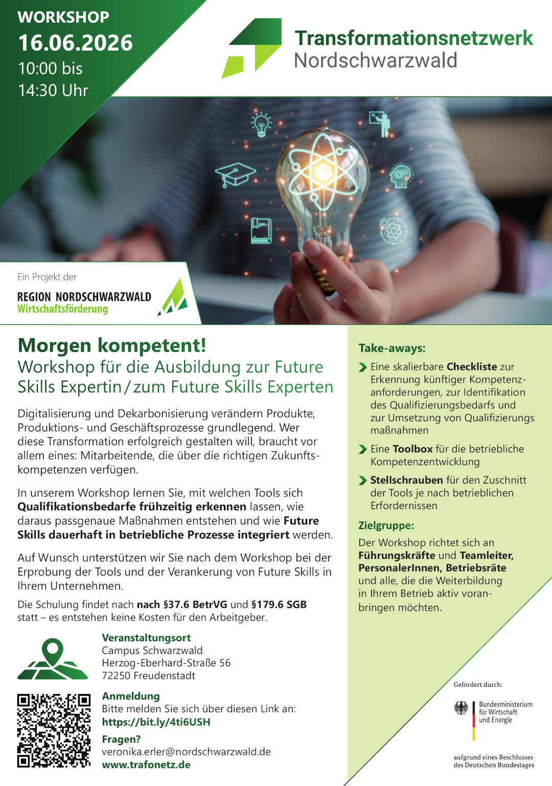 Workshop “Future Skills Experten” + Zu Google Kalender hinzufügen + iCal / Outlook exportieren Datum 16. Juni 2026 Uhrzeit 10:00 - 14:30 Weitere Informationen Anmeldung Standort Campus Schwarzwald Herzog-Eberhard-Straße 56 Freudenstadt Anmeldung Teile diese Veranstaltung SuchenSuchen Categories Mediathek TraFoNetz Recent Posts Startschuss: 15 Themenkarten – 15 Chancen für die Transformation! Wirtschaftsministerin empfängt Delegation aus dem Nordschwarzwald im Haus des Landtags Entscheidungsjahr 2025: Die Stunde der Transformation im Nordschwarzwald Impulse für die Zukunft: Transformationskongress macht Mut zur Veränderung Resolution zur Rettung der kleinen und mittleren Unternehmen im Nordschwarzwald