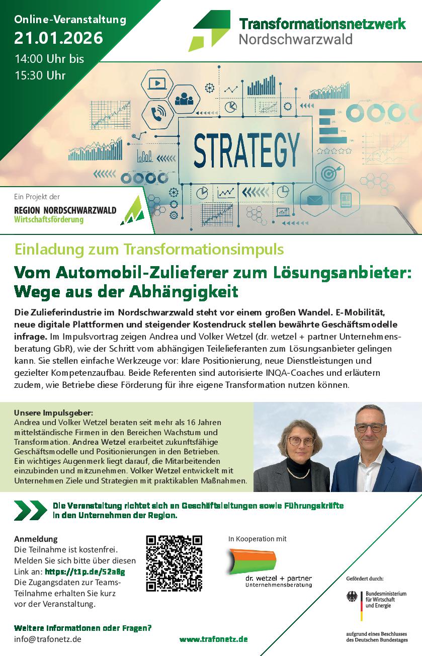Online-Transformationsimpuls: Vom Automobil-Zulieferer zum Lösungsanbieter: Wege aus der Abhängigkeit + Zu Google Kalender hinzufügen + iCal / Outlook exportieren Datum 21. Jan. 2026 Uhrzeit 14:00 - 15:30 Weitere Informationen Anmeldung Anmeldung Teile diese Veranstaltung SuchenSuchen Categories Mediathek TraFoNetz Recent Posts Wirtschaftsministerin empfängt Delegation aus dem Nordschwarzwald im Haus des Landtags Entscheidungsjahr 2025: Die Stunde der Transformation im Nordschwarzwald Impulse für die Zukunft: Transformationskongress macht Mut zur Veränderung Resolution zur Rettung der kleinen und mittleren Unternehmen im Nordschwarzwald Schlüssel zur Fachkräftesicherung – TraFoNetz-Workshop zu generationenübergreifender Zusammenarbeit