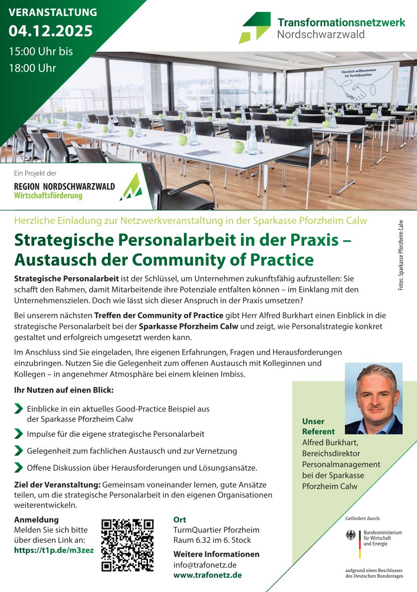 Strategische Personalarbeit in der Praxis – Austausch der Community of Practice + Zu Google Kalender hinzufügen + iCal / Outlook exportieren Datum 04. Dez. 2025 Uhrzeit 15:00 - 18:00 Weitere Informationen Anmeldung Standort TurmQuartier der Sparkasse Pforzheim Calw Poststraße 3, 75172 Pforzheim Anmeldung Teile diese Veranstaltung SuchenSuchen Categories Mediathek TraFoNetz Recent Posts Wirtschaftsministerin empfängt Delegation aus dem Nordschwarzwald im Haus des Landtags Entscheidungsjahr 2025: Die Stunde der Transformation im Nordschwarzwald Impulse für die Zukunft: Transformationskongress macht Mut zur Veränderung Resolution zur Rettung der kleinen und mittleren Unternehmen im Nordschwarzwald Schlüssel zur Fachkräftesicherung – TraFoNetz-Workshop zu generationenübergreifender Zusammenarbeit