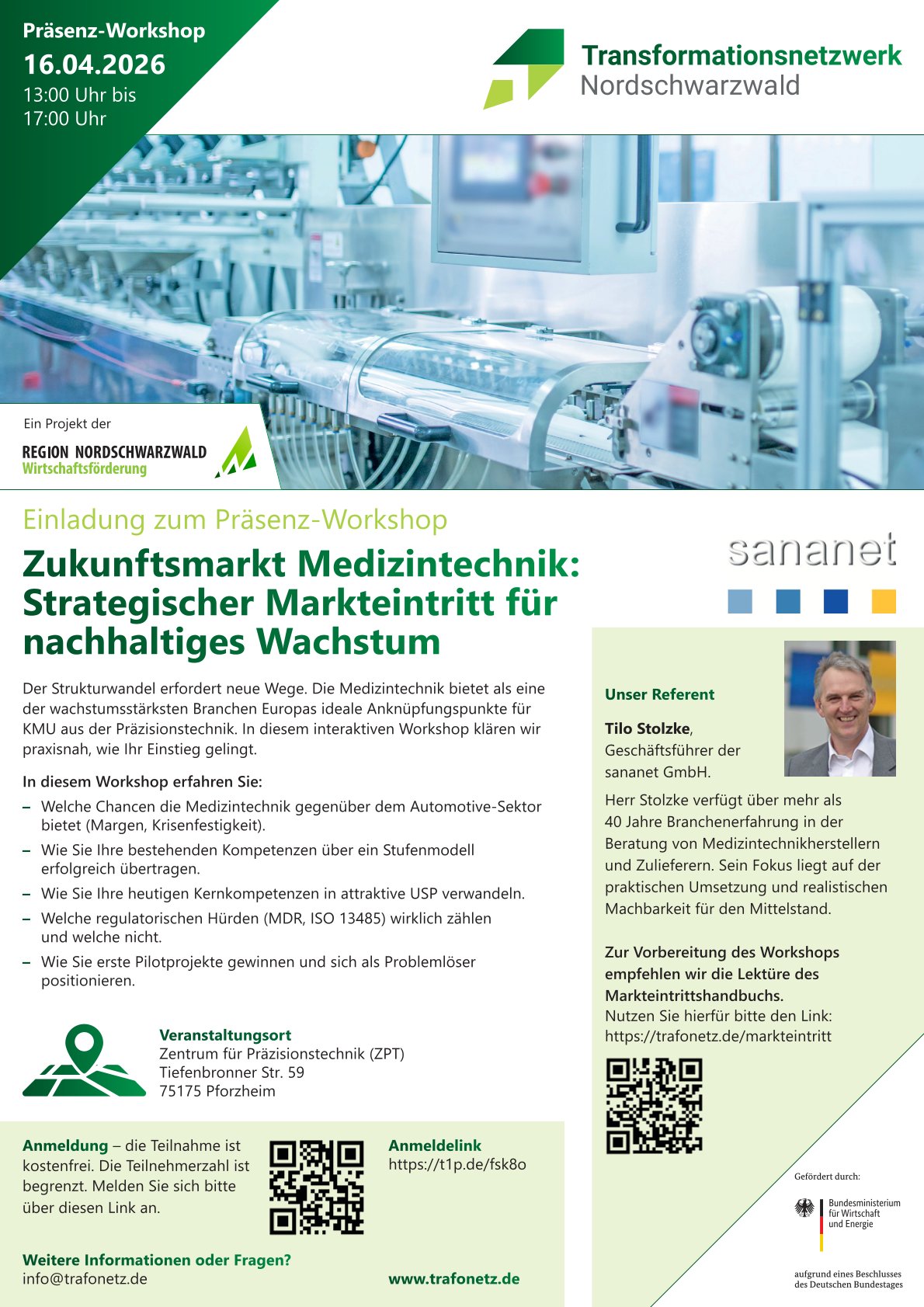 Zukunftsmarkt Medizintechnik: Strategischer Markteintritt für nachhaltiges Wachstum + Zu Google Kalender hinzufügen + iCal / Outlook exportieren Datum 16. Apr. 2026 Uhrzeit 13:00 - 17:00 Weitere Informationen Anmeldung Standort ZENTRUM FÜR PRÄZISIONSTECHNIK TIEFENBRONNER STR. 59 75175 PFORZHEIM Anmeldung Teile diese Veranstaltung SuchenSuchen Categories Mediathek TraFoNetz Recent Posts Startschuss: 15 Themenkarten – 15 Chancen für die Transformation! Wirtschaftsministerin empfängt Delegation aus dem Nordschwarzwald im Haus des Landtags Entscheidungsjahr 2025: Die Stunde der Transformation im Nordschwarzwald Impulse für die Zukunft: Transformationskongress macht Mut zur Veränderung Resolution zur Rettung der kleinen und mittleren Unternehmen im Nordschwarzwald